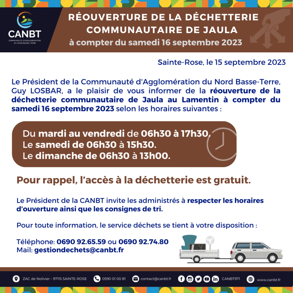 Le Président de la Communauté d’Agglomération du Nord Basse-Terre, Guy LOSBAR, a le plaisir de vous informer de la réouverture de la déchetterie communautaire de Jaula au Lamentin à compter du samedi 16 septembre 2023