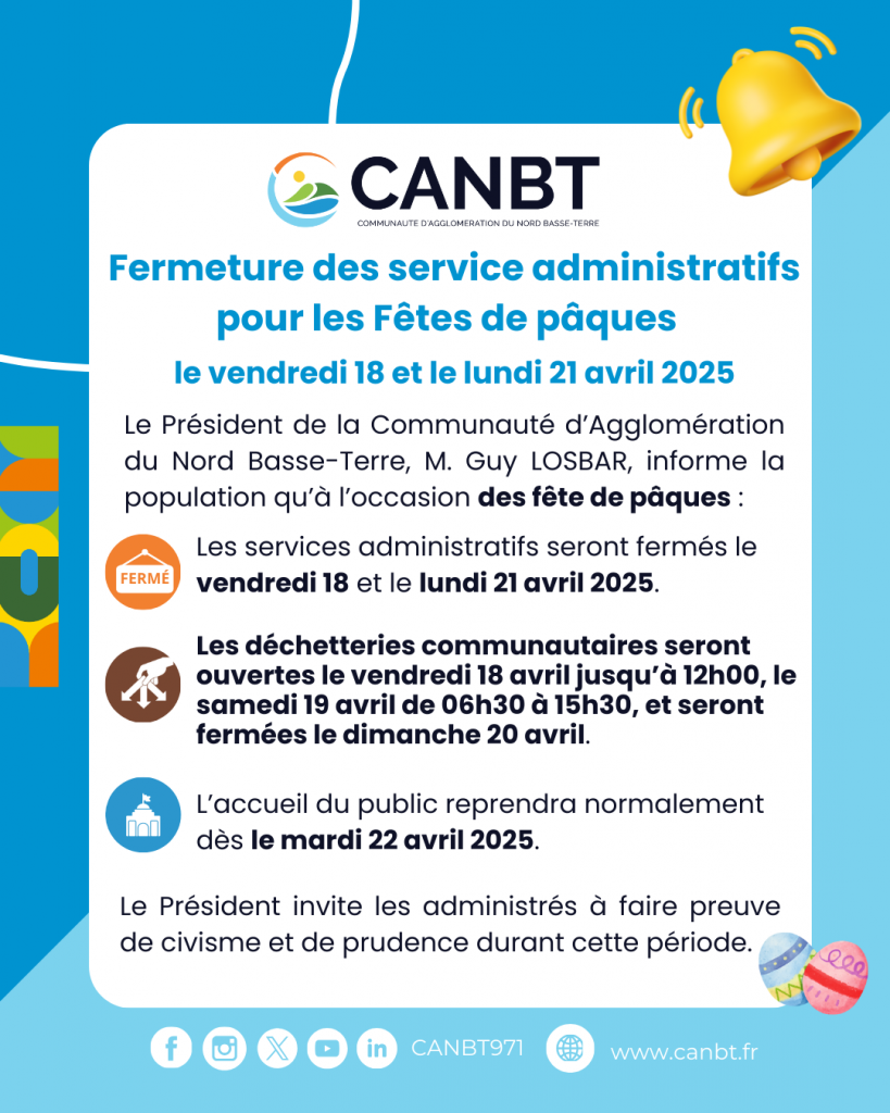 Le Président de la Communauté d’Agglomération du Nord Basse-Terre, M. Guy LOSBAR, informe la population qu’à l’occasion des fête de pâques :