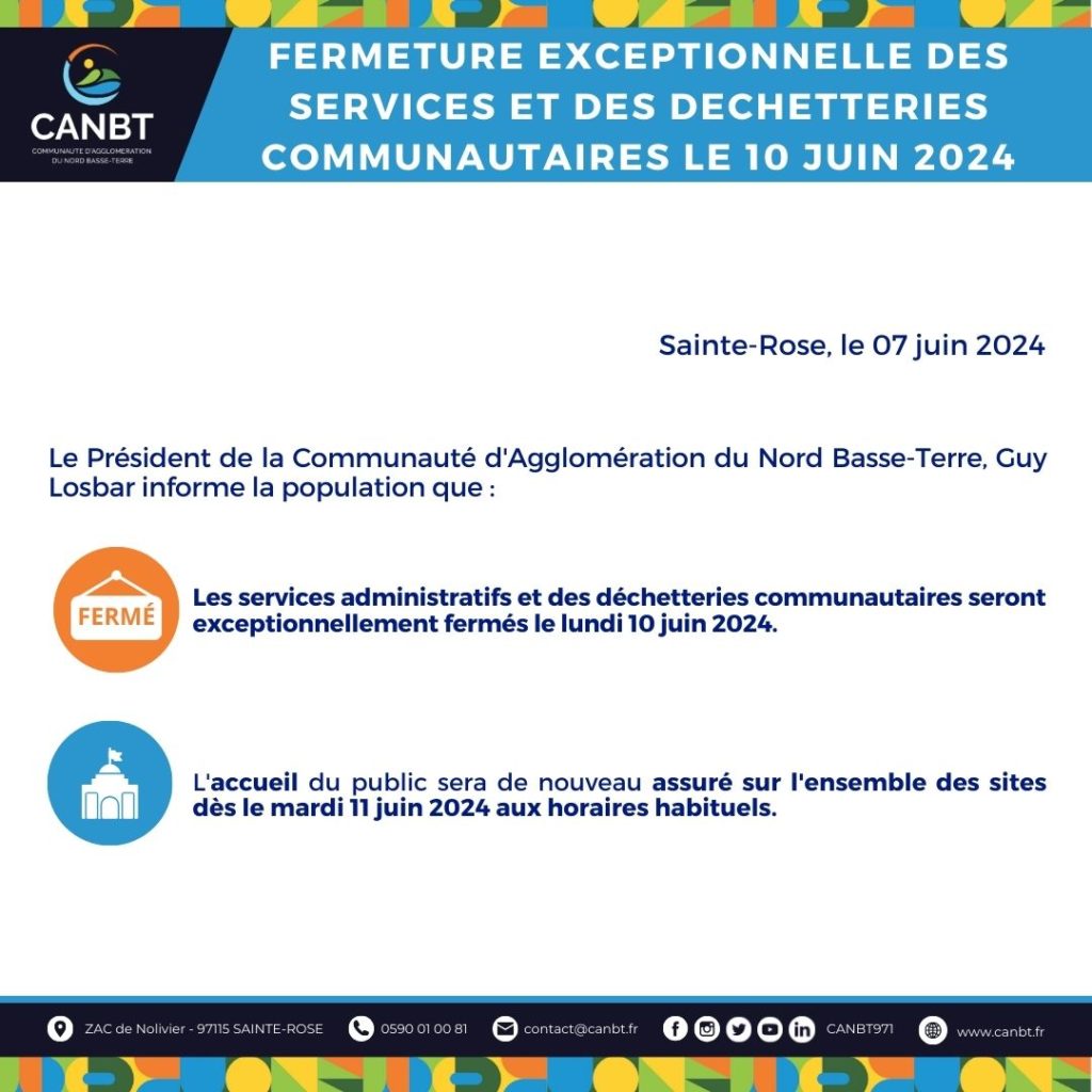Le Président de la Communauté d’Agglomération du Nord Basse-Terre, Guy Losbar informe la population que : – Les services administratifs et des déchetteries communautaires seront exceptionnellement fermés le lundi 10 juin 2024.- L’accueil du public sera de nouveau assuré sur l’ensemble des sites dès le mardi 11 juin 2024 aux horaires habituels.
