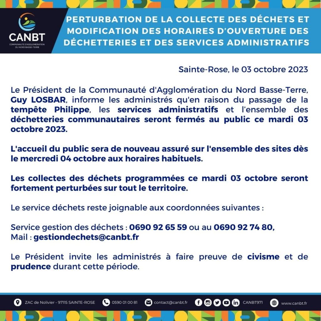 Le Président de la Communauté d’Agglomération du Nord Basse-Terre, Guy LOSBAR, informe les administrés qu’en raison du passage de la tempête Philippe, les services administratifs et l’ensemble des déchetteries communautaires seront fermés au public ce mardi 03 octobre 2023.