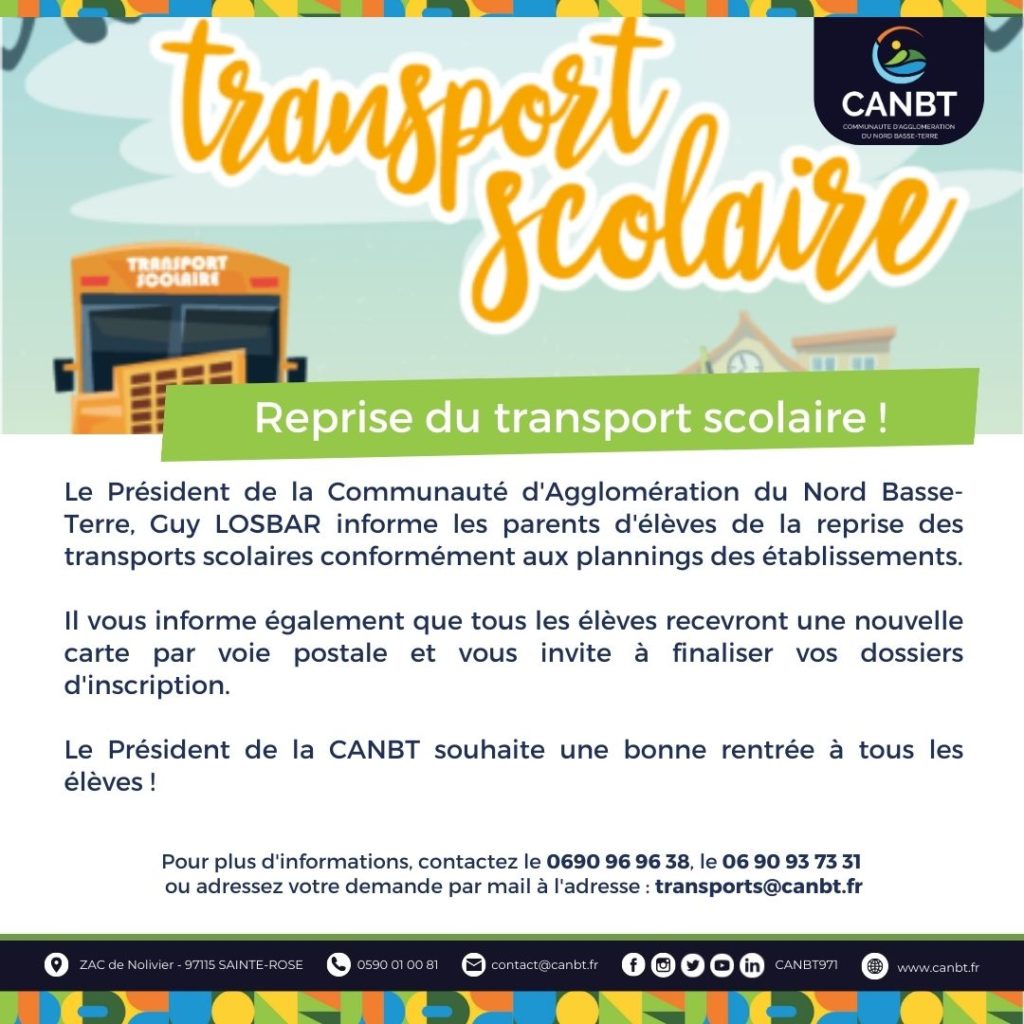 Le Président de la Communauté d’Agglomération du Nord Basse-Terre, Guy LOSBAR informe les parents d’élèves que la date limite d’inscription au transport scolaire est fixée au Vendredi 15 septembre 2023 inclus.