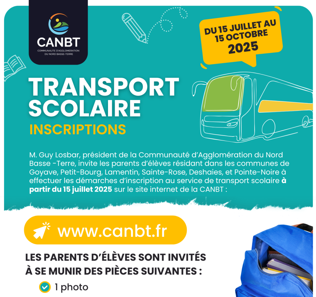 M. Guy Losbar, Président de la Communauté d’Agglomération du Nord Basse-Terre, invite les parents d’élèves résidant dans les communes de Goyave, Petit-Bourg, Lamentin, Sainte-Rose, Deshaies et Pointe-Noire à effectuer les démarches d’inscription au service de transport scolaire pour l’année 2025-2026.