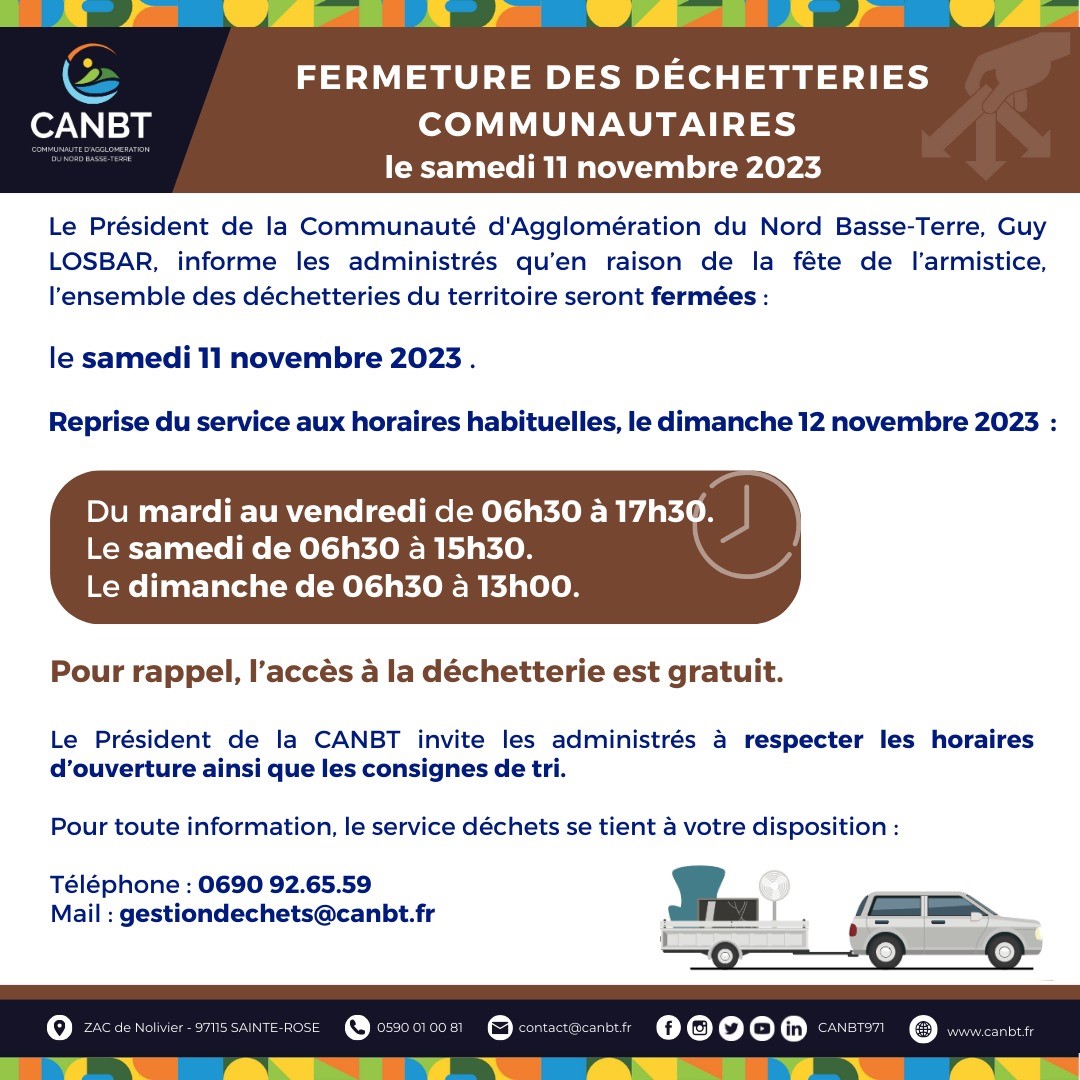 Le Président de la Communauté d’Agglomération du Nord Basse-Terre, Guy LOSBAR, informe les administrés qu’en raison de la fête de l’armistice, l’ensemble des déchetteries du territoire seront fermées :
