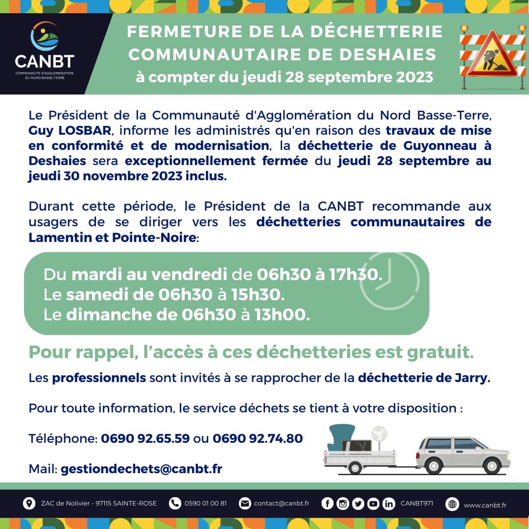 Le Président de la Communauté d’Agglomération du Nord Basse-Terre, Guy LOSBAR, informe les administrés qu’en raison des travaux de mise en conformité et de modernisation, la déchetterie de Guyonneau à Deshaies sera exceptionnellement fermée du jeudi 28 septembre au jeudi 30 novembre 2023 inclus.