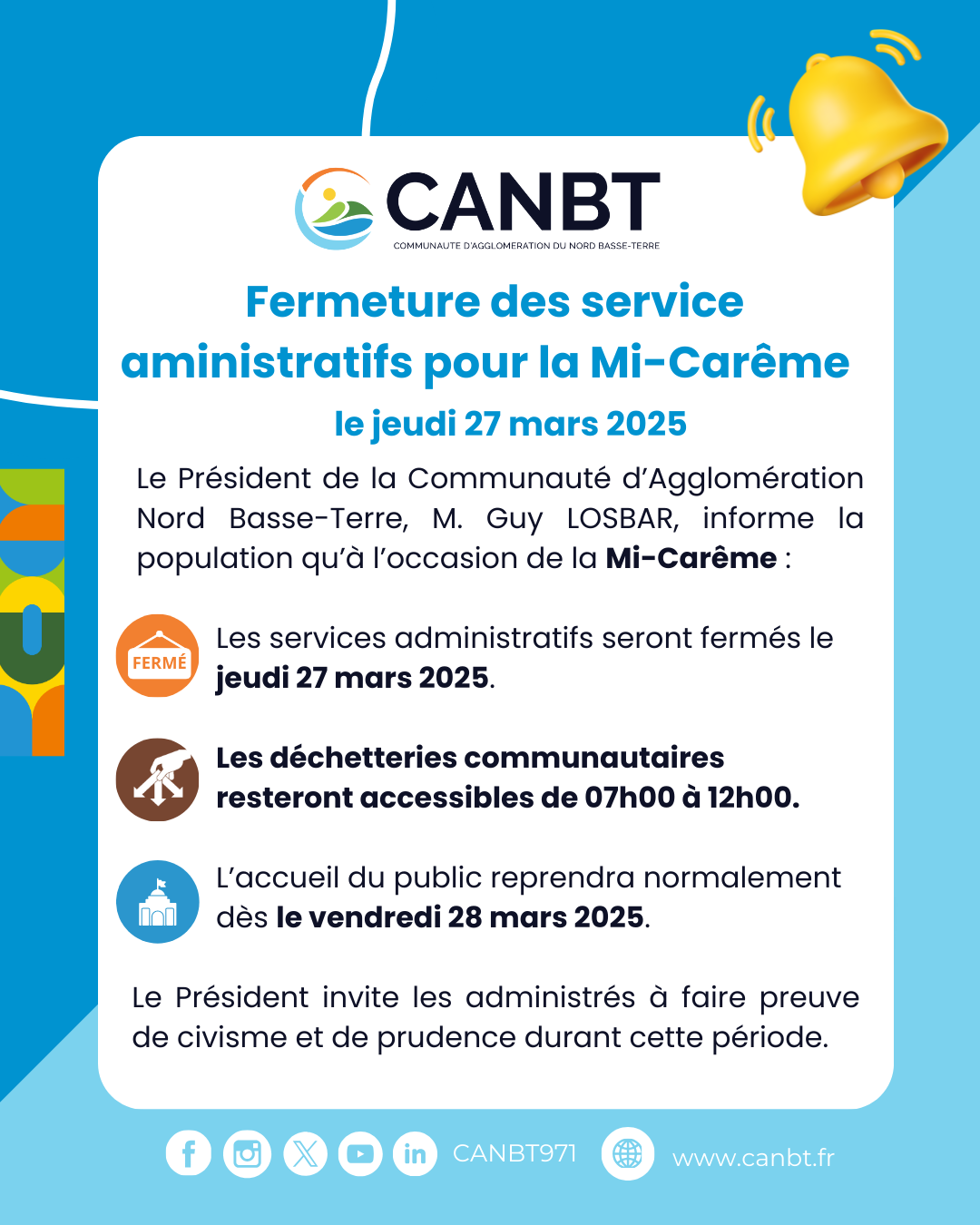 Le Président de la Communauté d’Agglomération Nord Basse-Terre, M. Guy LOSBAR, informe la population qu’à l’occasion de la Mi-Carême :
